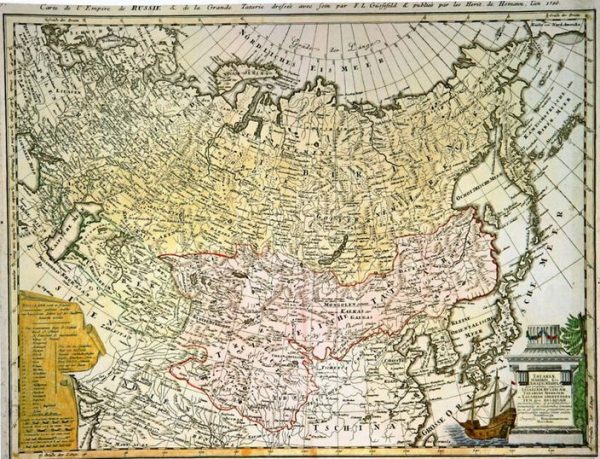 Giymon Delil və Tobias Konard Lotter tərəfindən tərtib edilərək, 1772-ci ildə Ausburqda dərc edilmiş xəritə (Guil. Delisle. Tobias Conrad Lotter. Asia. Augsbourg. 1772). Boyanmış qravüra. Rusiya Dövlət Tarix Muzeyinin xəritəşünaslıq bölməsində saxlanılır (Moskva, şifrəsi ГО-7891077/4).